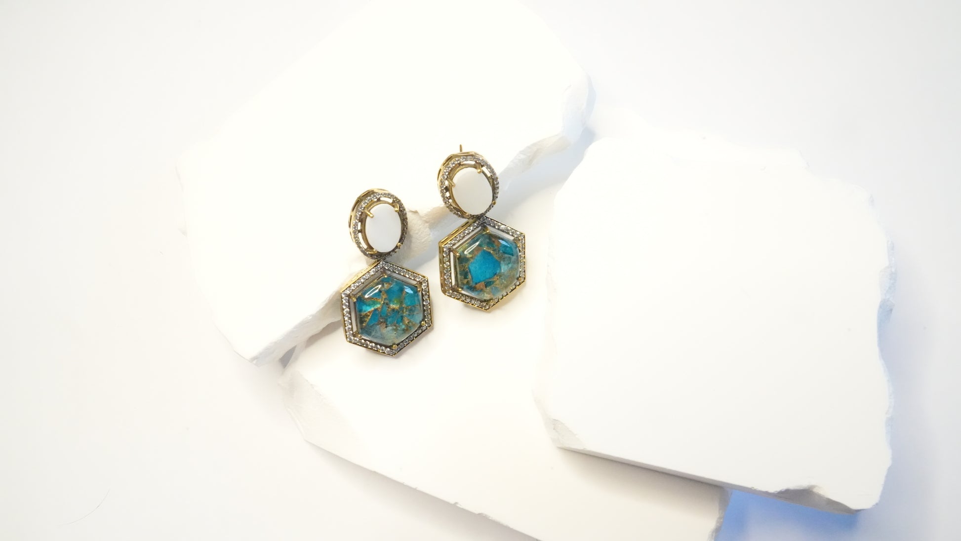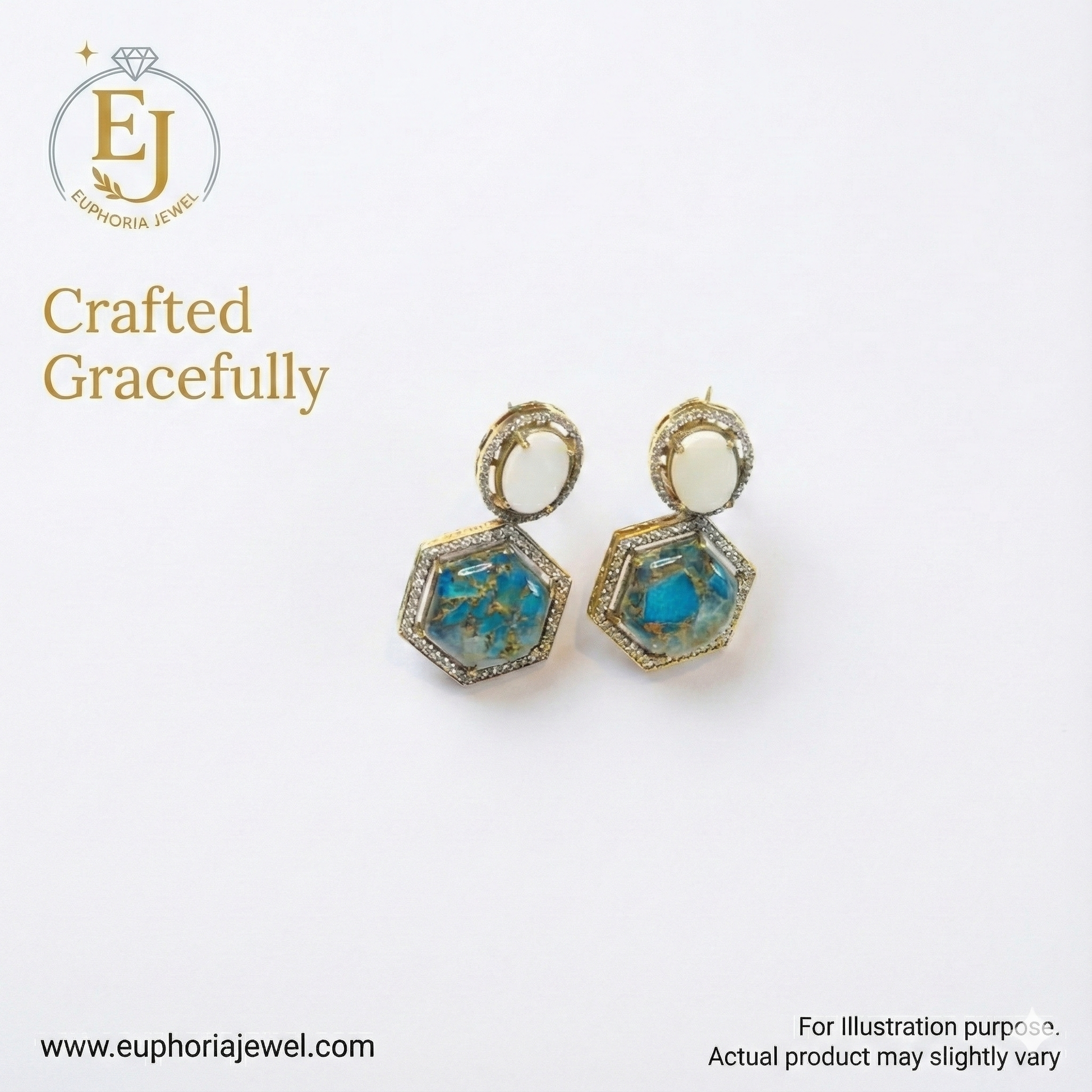 Blending bohemian vibes with serious glamour, these earrings feature a stunning turquoise copper mosaic stone framed by sparkling pavé crystals set in gleaming gold-tone metal. They are the ultimate statement piece to transition your look from day to night.