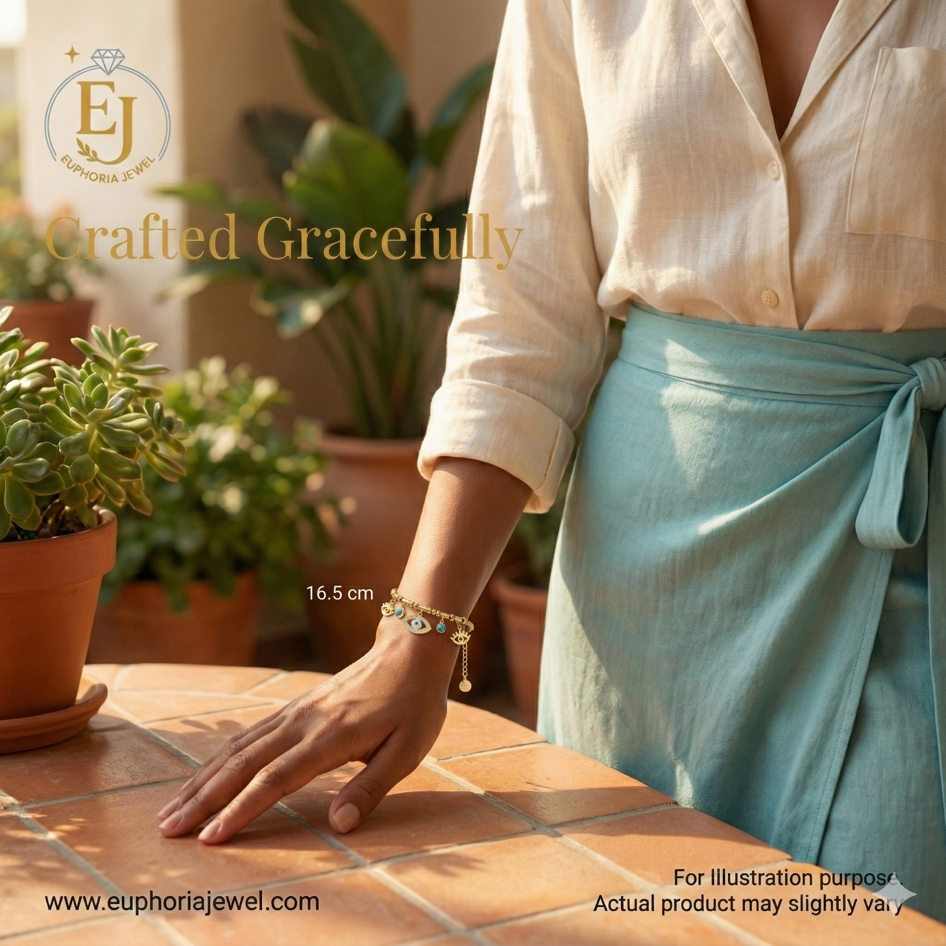 Protect your energy in style with the Evil Eye Harmony Charm Bracelet. Crafted from premium stainless steel with a radiant gold-tone finish, this bracelet features delicate turquoise and evil eye charms accented with subtle sparkle. Designed as a symbol of positivity and protection, it’s the perfect blend of elegance and meaning.